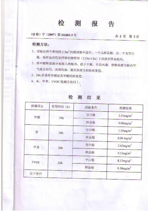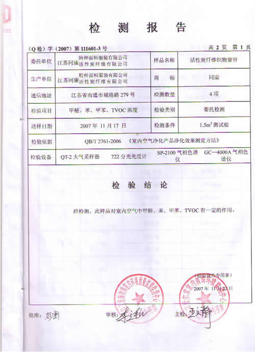 活性炭纖維織物窗簾檢測報告