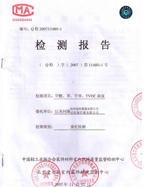 活性碳纖維靠墊檢測報告
