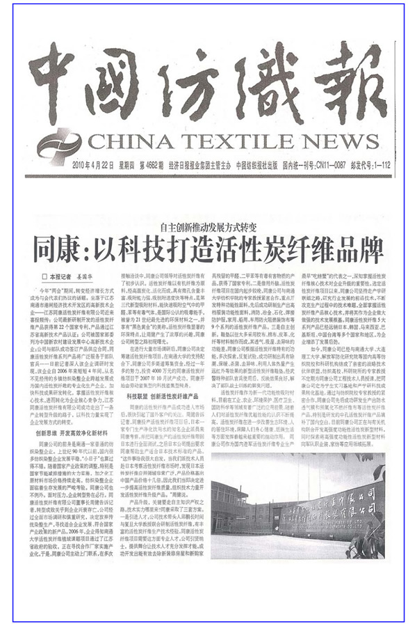 中國紡織報——同康:以科技打造活性碳纖維品牌